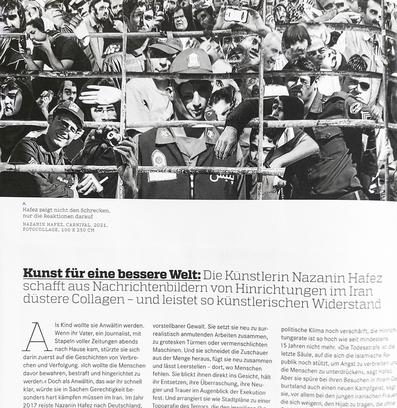 Nazanin Hafez (born 1991 in Shiraz, Iran) is an Iranian visual artist and filmmaker working and living between Iran and Germany. In her artistic practice, she critically engages with social and political injustices, particularly focusing on the impacts of the repressive regime in Iran. Her current work explores the boundaries of depicting scenes of violence and their actors and victims, always striving for an empathetic and dignified approach to the painful subject matter. She employs various mediums, from photography and collage to video and installations.